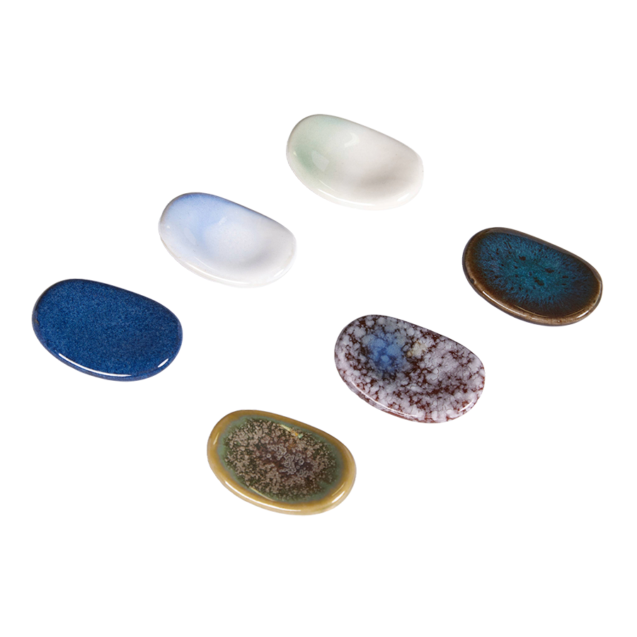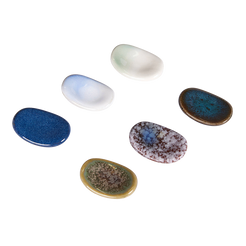 These ceramic chopstick rests are made in Japan and finished with beautiful glazed colors. Each piece has a smooth oval shape that keeps chopsticks elevated and clean during meals.
