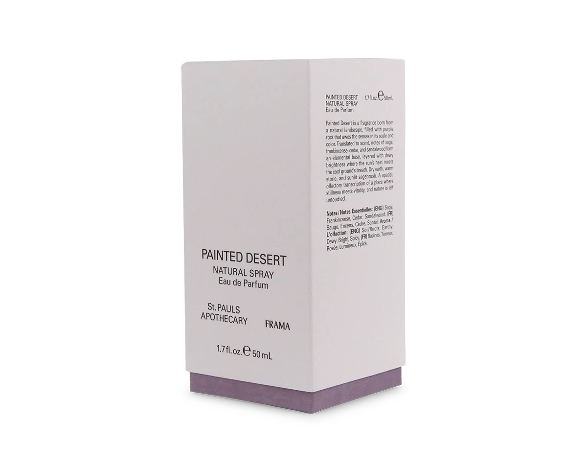 Frama's Painted Desert is a fragrance born from a natural landscape that awes the senses in its scale and color. Notes of sage, frankincense, cedar, and sandalwood form an elemental base, layered with dewy brightness where the sun’s heat meets the cool ground’s breath. Desert heat and ancient stone. Earth and air in suspended dialogue.