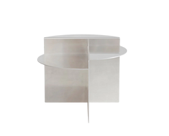 Frama Rivet Side Table is a versatile furniture piece suitable for any room. Its circular top is divided into three different levels, creating a dynamic surface. Based on a riveting technique suitable for making perpendicular joints between separate, laser-cut raw aluminum sheets, the table is put together by hand using a hammer in a cold-forming assembly process developed by designer Jonas Trampedach in 2011.